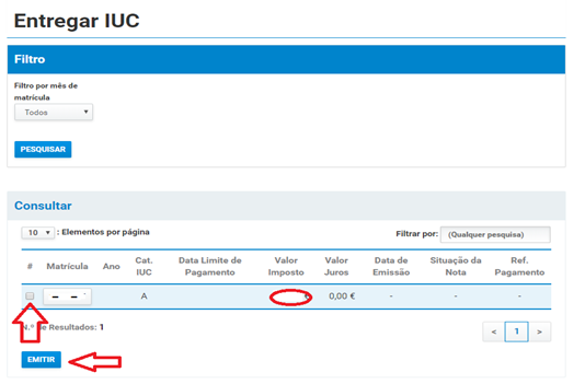 5 Les détails des véhicules que les Finanças ont enregistrés comme vous appartenant s’afficheront alors. Faites défiler la page jusqu’à « Consultar ». Cochez la case correspondant au véhicule pour lequel vous souhaitez faire la demande, puis cliquez sur le bouton « Emitir ».